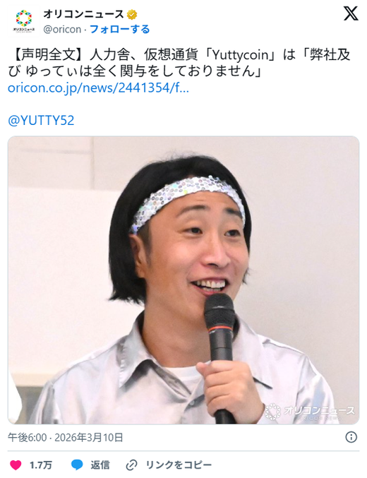 ゆってぃ所属事務所、仮想通貨「Yuttycoin」で注意喚起「全く関与をしておりません」 本人もびっくり